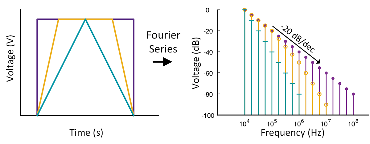 切換頻率和邊延速率(即元件的狀態改變速度)決定了在切換期間產生的 EMI。通常情況下,最高發射值會出現在切換頻率,較 低峰值則出現在切換頻率的整數倍。例如,如果切換頻率為 100 kHz,那麼將在 100 kHz、200 kHz、300 kHz 等頻率出現發射頻譜尖峰。圖 1 展示了具有不同上升時間的脈衝波形在不同頻率條件下的頻譜發射衰減情況。對於具有無限 dv/dt 和 di/dt 值的理想方形波,發射頻譜的幅度將以 20 dB/十倍頻程的速度遞減。對於具有最慢 dv/dt 和 di/dt 的理想三角形波,頻譜將下降 40 dB/十倍頻程。因此,對於電力電子設備所產生的梯形波,頻譜衰減將在 20 dB/十倍頻程到 40 dB/十倍頻程之間,衰減幅度取決於邊延速率。隨著元件切換速度加快,諧波頻率的發射頻譜預計會增加,而跨頻衰減速度將減慢。