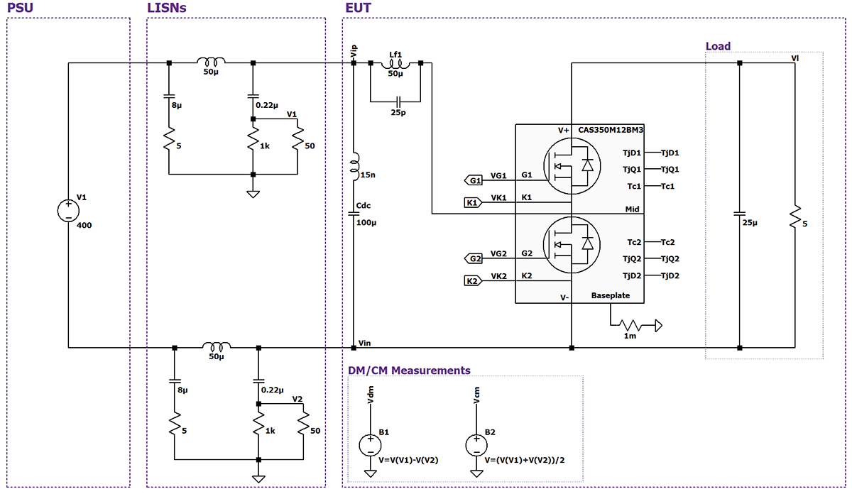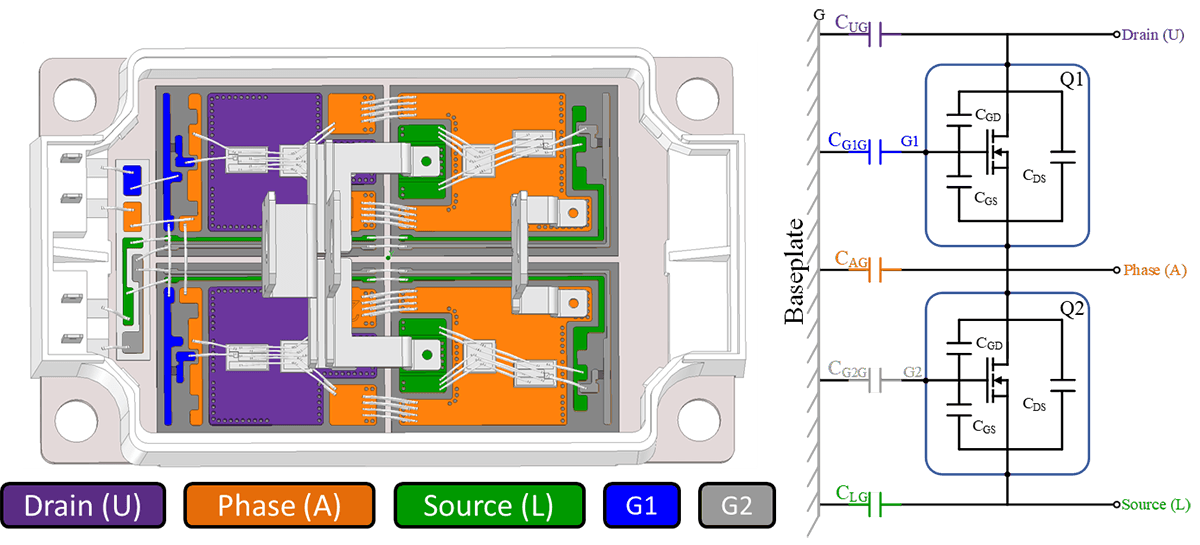 功率模組具有恆定一致的耦合值,因此在功率轉換器的設計階段才能夠模擬,並減少 EMI。對於功率模組而言,半導體和底板之間的絕緣電容稱為底板電容 (BPC)。