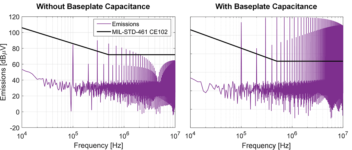 有底板電容和無底板電容時 V1 的光譜波形如圖 5 所示。圖中疊加了 MIL-STD-461 CE102 的發射限制條件;高於此線的任何光譜含量都表示未滿足該標準。雖然在這兩種配置條件下系統都不符合 EMC 要求(考慮到未使用 EMI 濾波器,這並不奇怪),但有底板電容的系統在 100 kHz 至 10 MHz 範圍內的光譜含量高於發射線限制。而無底板電容的系統在 2 MHz 以上頻率時符合標準。請注意,這只是一個理想化示例;在實際系統中,還會有其他共模路徑與底板電容並聯。