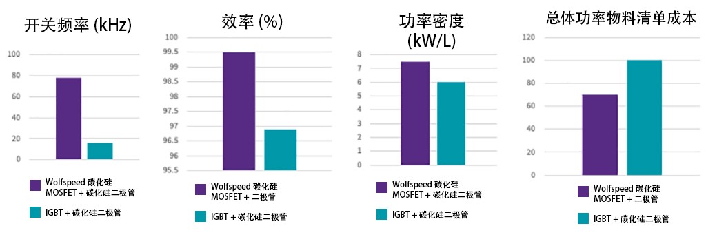 与 IGBT+碳化硅 混合解决方案相比,在三相逆变器中使用 Wolfspeed 1200 V MOSFET和1200 V 肖特基二极管来打造完备的碳化硅解决方案,能够将总成本降低多达 30%,并显著提高开关频率以及效率和功率密度。
