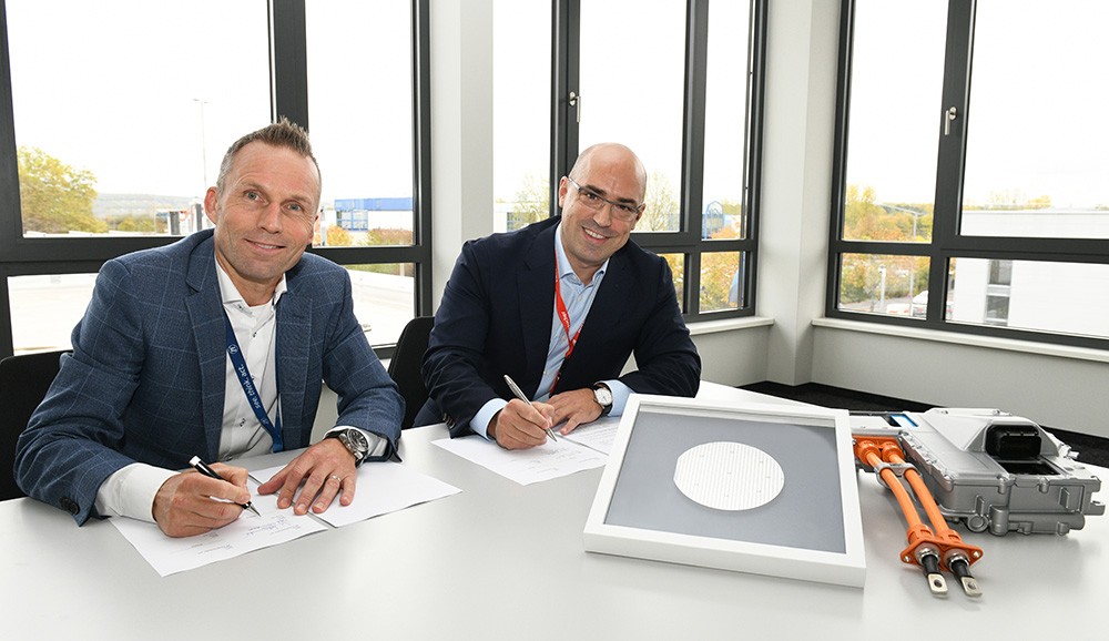 Jörg Grotendorst, Head of ZF Division E-Mobility and Cengiz Balkas, Senior Vice President and General Manager of Wolfspeed signing the partnership
