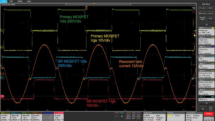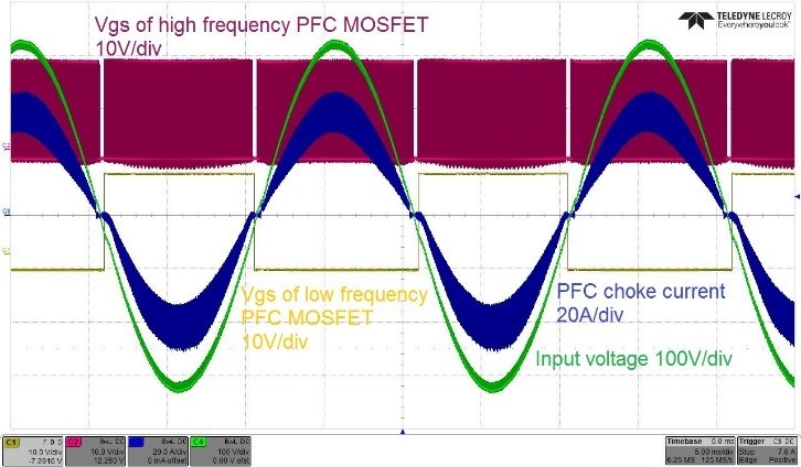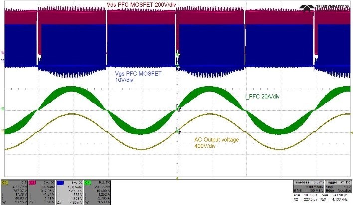 The testing waveforms of totem pole PFC and CLLC stage in charging mode under 380V battery voltage, 230Vac input and full load are shown in Fig. 6 and Fig. 7 respectively.
