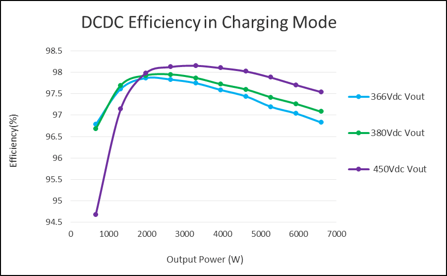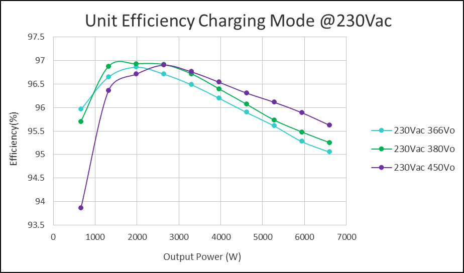 The efficiency of the CCM totem pole PFC, DC/DC stage and the entire unit in charging mode at 230Vac input are shown in Figs. 10, 11 and 12 respectively. With a lower DC-link voltage, the totem pole PFC efficiency is higher. The unit level peak efficiency in charging mode exceeds 96.5%. C3M0060065D engineering samples are used in the prototype.