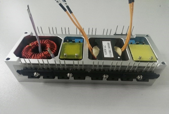 Figure 5 shows the integrated heatsink for both the semiconductors and magnetics. The power semiconductors are mounted on the outer side of the heatsink. The magnetics are potted by thermal compound inside the slots of the same heatsink. C3M0060065D engineering samples are used in the prototype.