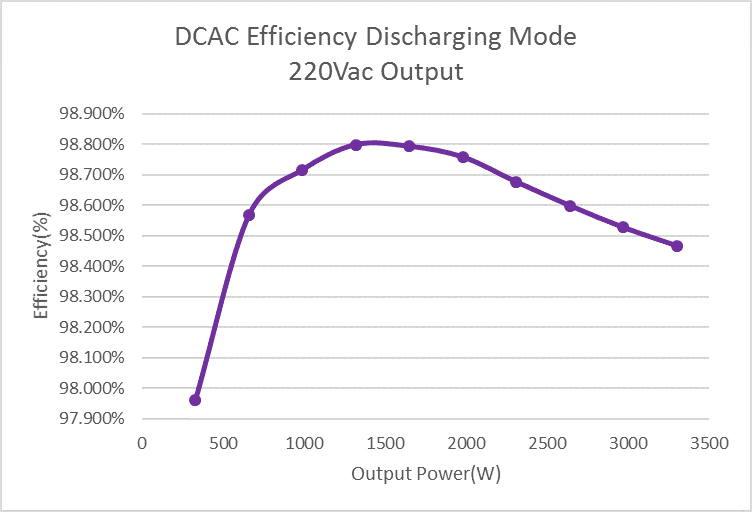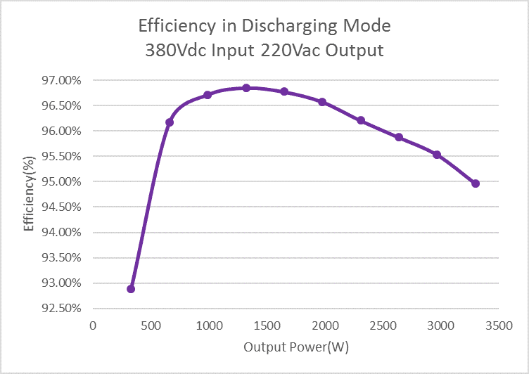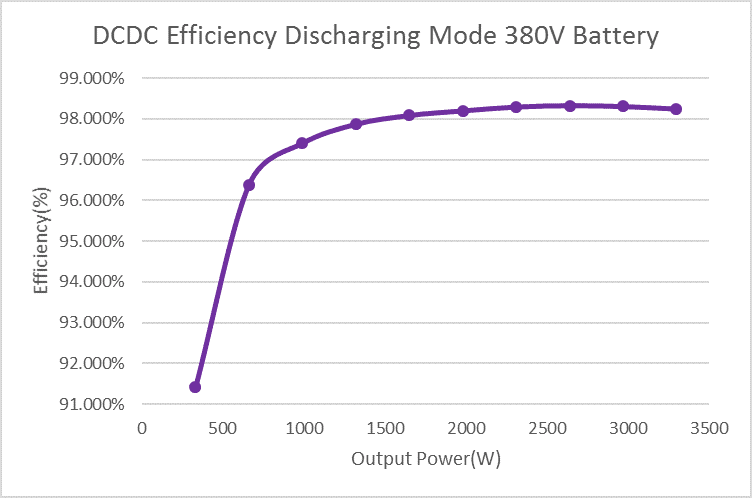 Figure 13 shows the efficiency of DCDC in discharging mode at 380V battery voltage. Figure 14 shows the efficiency of DCAC stage in discharging mode for 220Vac output. Figure 15 shows the unit level efficiency in discharging mode for 220Vac output. The output power in the efficiency test is up to 3.3kW in discharging mode here. The unit level peak efficiency in discharging mode is also above 96.5%.