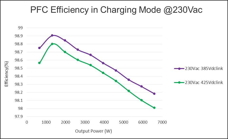 A fast reverse recovery body diode is required for efficiency and reliability for both the CCM totem pole PFC and bidirectional CLLC resonant converter. A smaller Coss is preferred for high-frequency hard-switching operations for the totem pole PFC. A smaller Coss is also critical for achieving zero voltage switching (ZVS) with a lower magnetizing current and a shorter blanking time for the CLLC resonant converter. With reduced magnetizing current, the conduction loss and turn-off switching loss of the MOSFET can be minimized. That is important for optimizing the efficiency of the CLLC converter, particularly at high frequencies. The maximum DC-link voltage is 425V and the battery is 450V. In consideration of voltage de-rating reliability requirements, a 650V SiC MOSFET is preferred in the OBC application.