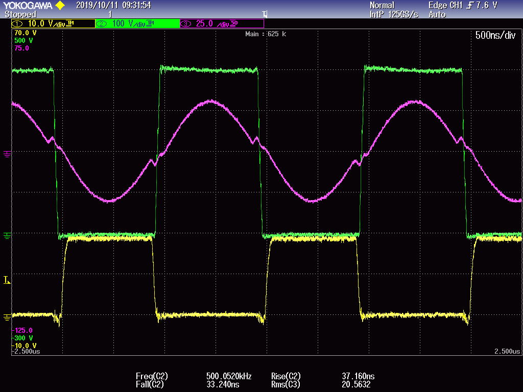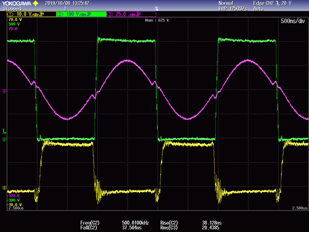 Fig. 5 shows the measured efficiency vs. switching frequency for 400V/16A DC output. The optimum switching frequency ranges from 500 kHz to 650 kHz without considerable efficiency drop. The decrease in efficiency as the switching frequency increases is mainly due to increased frequency-dependent copper losses and core loss in the LLC transformer [7] - [9] and PCB trace loss. The measured power loss due to the gate drive increases by 2.2W from 500 kHz to 1 MHz while there is a 3.5W power loss increase for each MOSFET (from 20.06 W to 23.56 W simulated). Fig. 6 shows the plots of efficiency vs. output power in open-loop operation. A peak efficiency of about 98.5% is achieved at half load (~3 kW). Fig. 7 shows the captured gate-source and drain-source waveforms of the primary-side upper switch along with the primary-side resonant current waveform at 550 kHz and 400 V input.