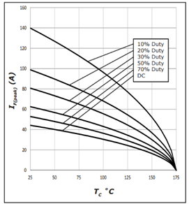 器件的最大功率损耗与环境温度成线性关系,Vf也会随着结温的升高而增加,如果数据手册中的图表不能覆盖您的应用,Wolfspeed可以提供每个组件的PLECS模型。SiC二极管的能量将被表示为I2t,并转换为在特定时间段内在特定的外壳温度(TC)下所能吸收的最大能量。这类似于保险丝的熔断能量。