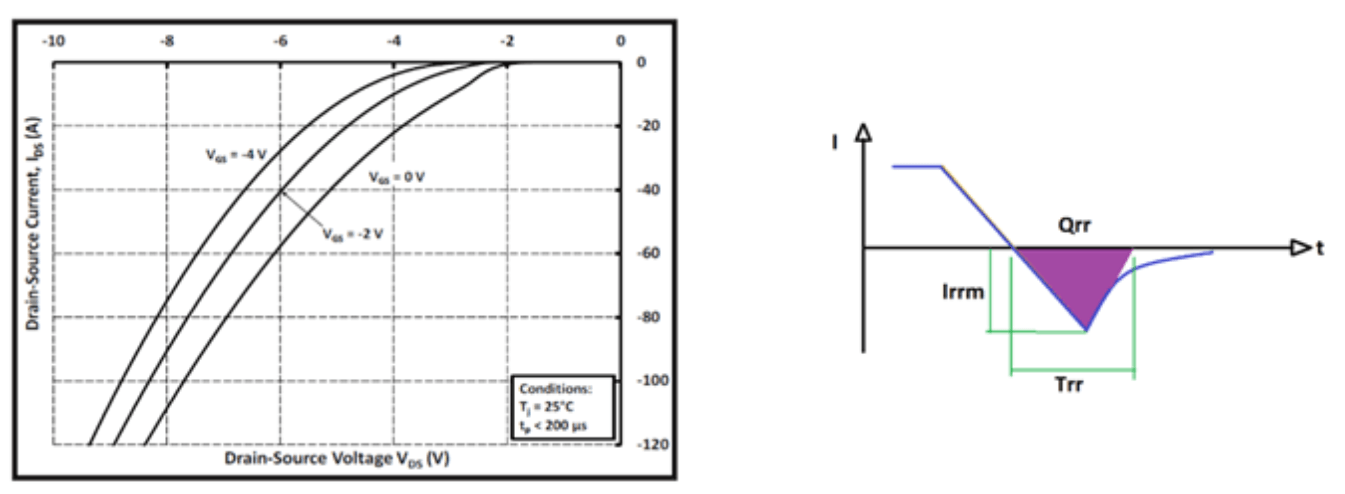 体二极管的特性(如图5所示)描述了当电流从源极流向漏极时器件的变化,例如体二极管的正向电压和电流。反向 恢复电荷(Qrr)是在反向恢复时间(trr)内p-n结必须扫出的总电荷,而反向恢复峰值电流与流入节点的电流量有关。器件关断时,适当的控制di/dt,这也是重要的。