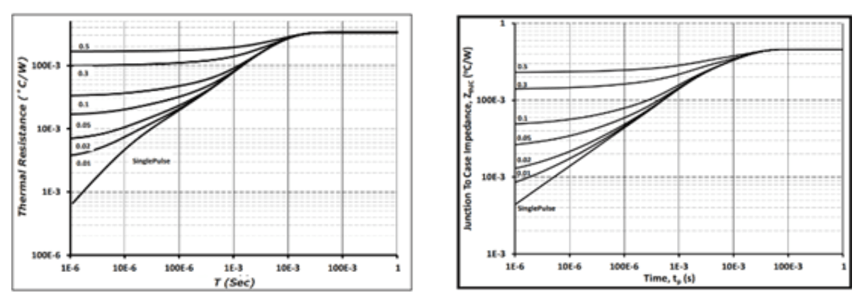 最后,二极管的热阻和碳化硅MOSFET的热阻非常类似,是从结点到外壳的热阻,可以在单个器件或内部并联两个的器件上观察到。同样,这对于散热方法的评估和运行过程中的结温是非常重要的。Z0JC,即瞬态热阻抗曲线,同时考虑了材料的热阻和热容。图9展示了碳化硅(SiC)二极管和碳化硅MOSFET的这一特性。