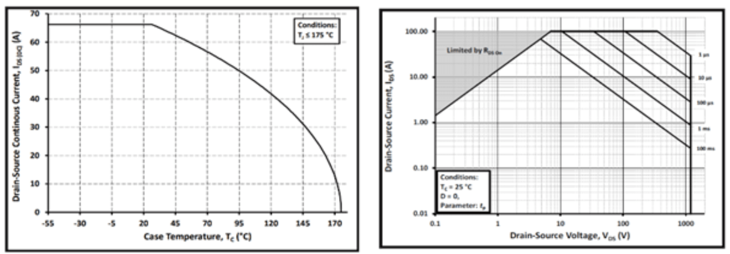 全温度范围内的连续漏极电流值如下图(图2),会随温度降额,并且受耗散功率PD、导通电阻RDS(on)和连接线尺寸的限制。设计的最差情况下的连续有效值电流不能超过这个额定值。脉冲漏极电流与晶圆的能量限制相一致,其持续时间受外壳TC、结温TJ,MAX、温度和瞬态热电阻(ZTH)的限制。考虑到功率损耗、热阻抗和脉冲定时特性,定义出安全运行区域(图2所示)。对于这两个电流值,温度都是电流的函数,设计人员需要在器件的结温和连续电流之间平衡。