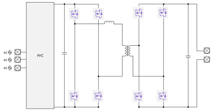 电动汽车(EV)直流快速充电机绕过安装在电 动汽车上的车载充电器,直接为电池提供快速直流充电。如下图所示,直流快速充电机由一级AC-DC 和一级 DC-DC组成: