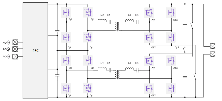 图 6 显示具有双向流动设计和总共 12 个 SiC MOSFET 的 两 电平 LLC 电路示例,该电路可实现简单、灵活的控制,具有高效率和磁性元件小的特点。在这种用于直流快速充电的配置中,继电器可以针对 400 V 和 800 V 操作进行切换,满足低或高充电电流的需求。一个不足之处在于:LLC 设计通常具有一个狭窄的最佳应用点,需要谨慎设计谐振回路。