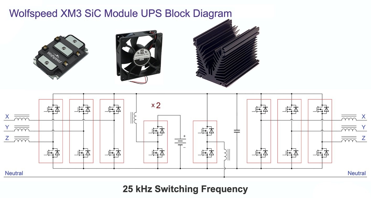 A component-by-component comparison (Figure 3) of the IGBT- and Wolfspeed XM3 module-based double-conversion UPS shows a clear advantage from the SiC system: