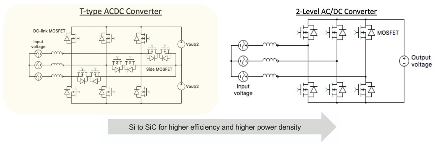 车载充电机 (OBC) 通常采用单个 3 kW 至 22 kW的模块。充电桩则是采用 15 kW 至 30 kW 的模块,堆叠组合实现目前的 150 kW,及最新目标的 350 kW。最新的 SiC 器件、封装和电路拓扑结构,则可在不久的将来以数量更少的 60 kW 模块来实现这一目标。