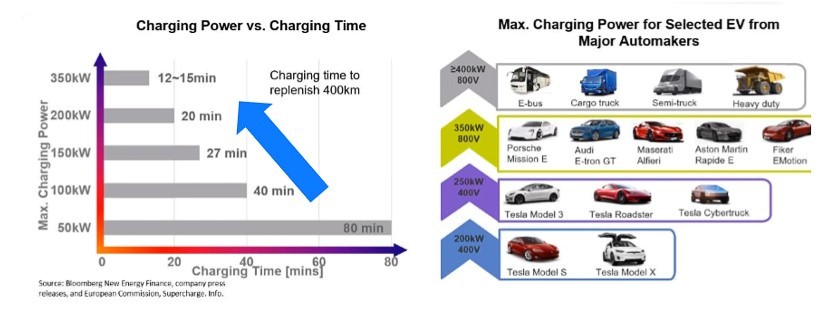 特斯拉汽车的 400 V “超级充电站” (Supercharger) 网络掀起了这一潮流,但这还不足以实现 15 分钟充电的目标。因此,导 入电压高达 800 V 的架构发展便成为重要的趋势 (图1)。