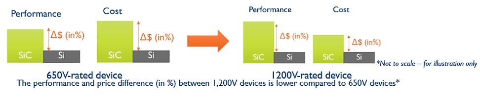 - 与 Si 相比,SiC 有着更低的导通电阻和断态漏电流,因此有助于提高效率。