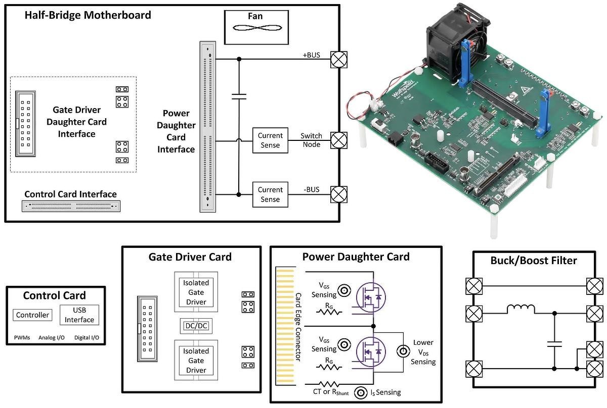 该套件的中心是一块母板 ,其金手指防呆连接器作为子卡的接口,是所开发功率级功能的基础。这使工程师可以快速评估各种半桥功率模块、栅极驱动器、控制卡和其他潜在配件。设计人员可以测试高达 1200 V 的所有 Wolfspeed 分立器件,同时搭配生态系统中多家制造商生产的系列丰富的栅极驱动器。